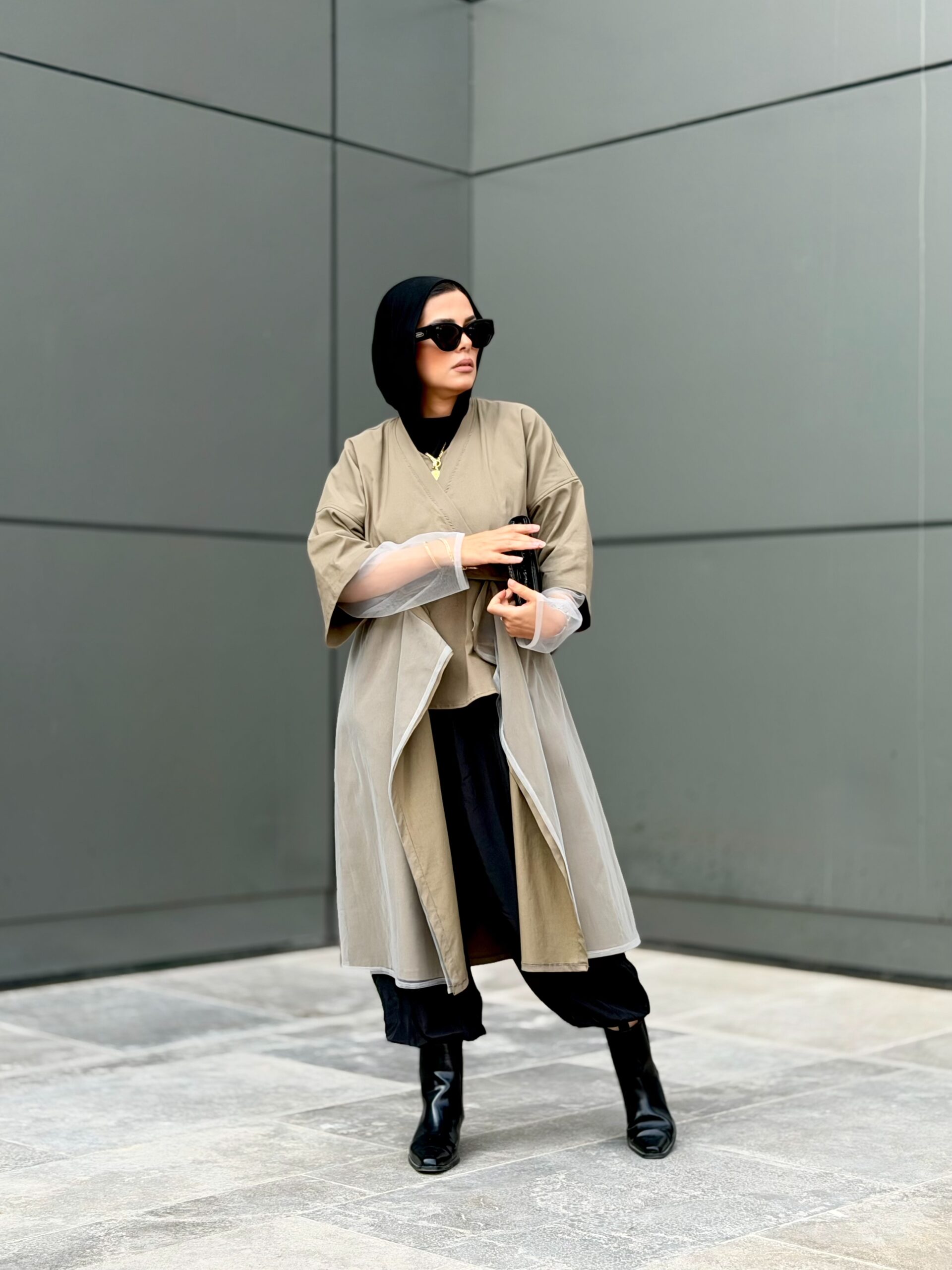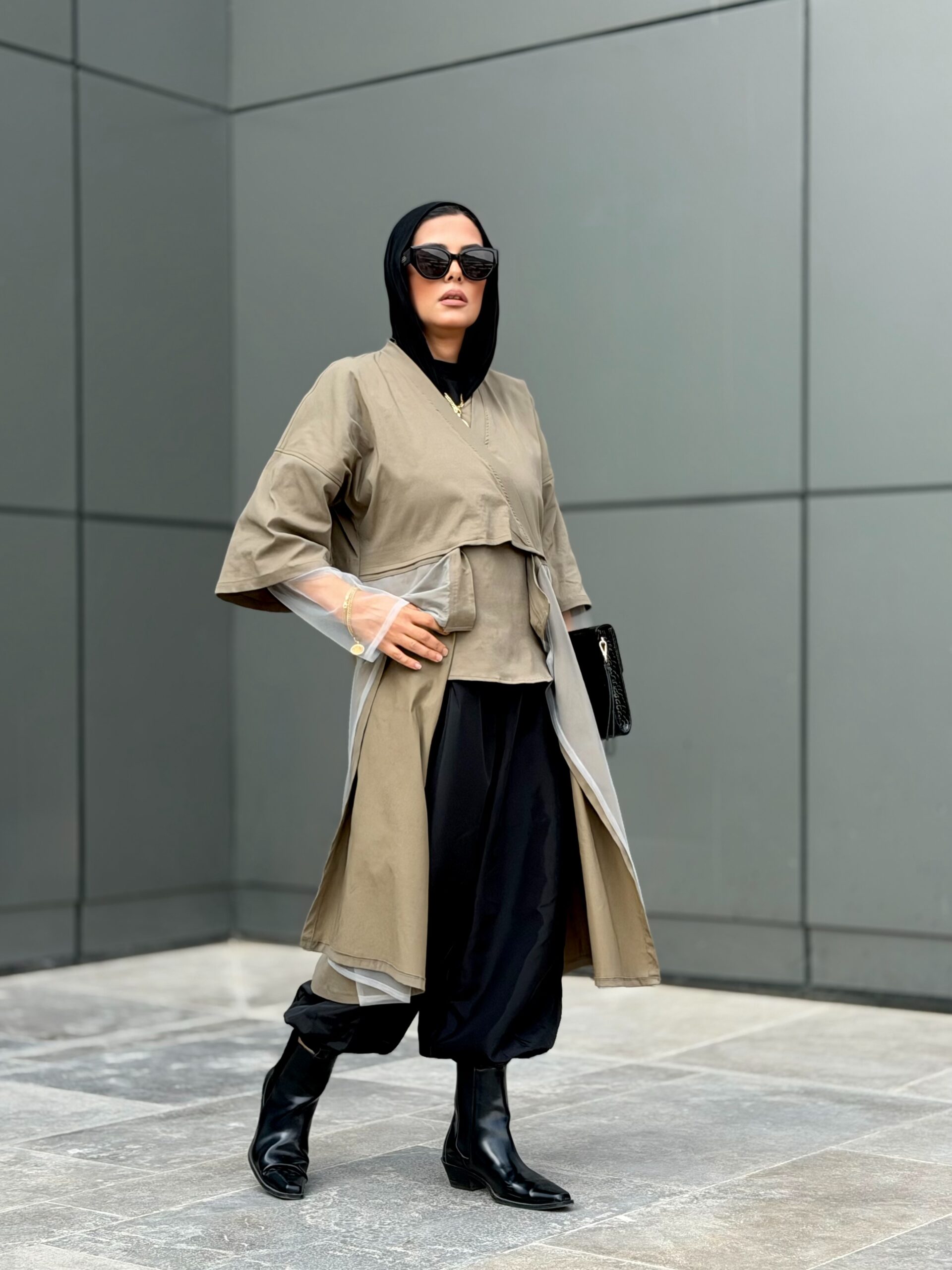 A sophisticated kimonostyle piece with mixed fabrics for a woman who plays by her own code.