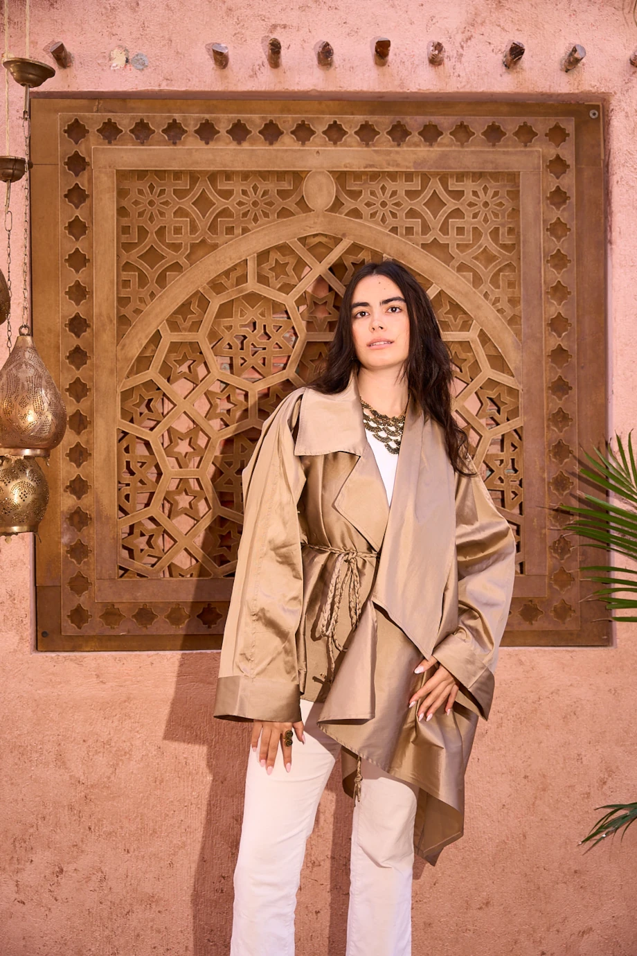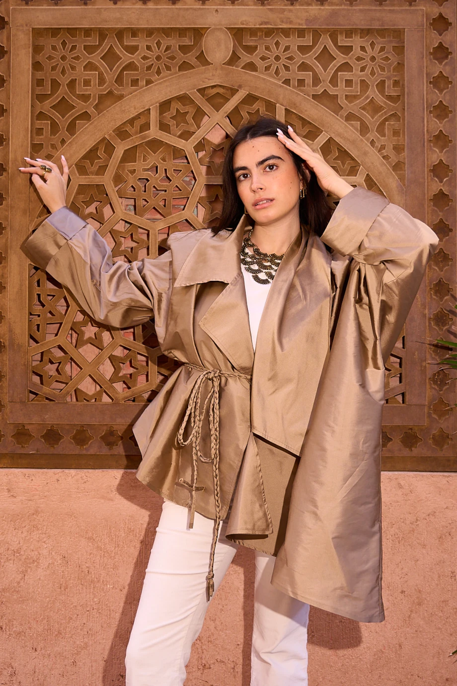 An exquisite piece with asymmetric details and a hand braided belt that will definitely be a showstopper.