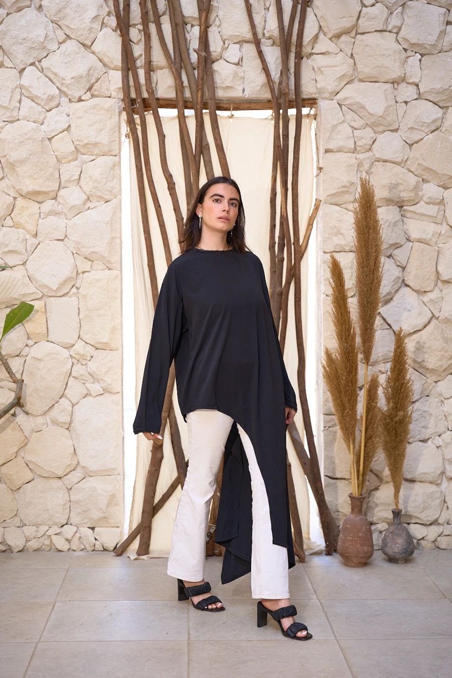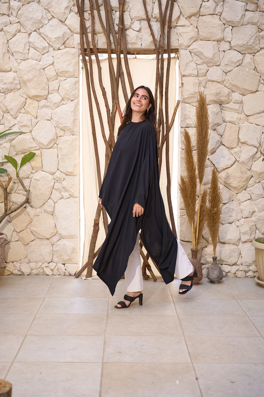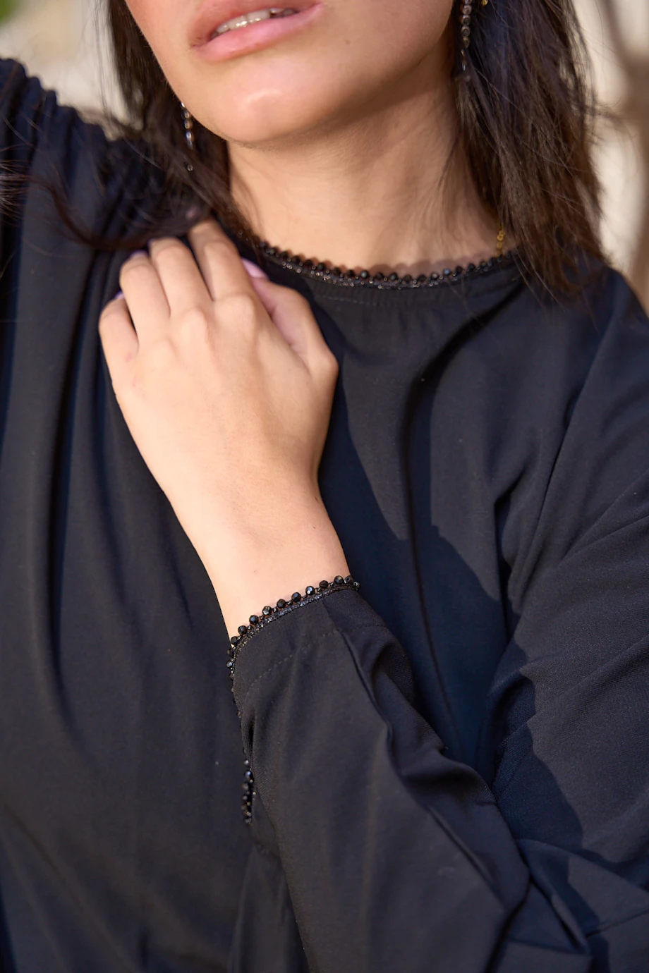 An asymmetric poncho top with bead embellishments to flaunt all body types.