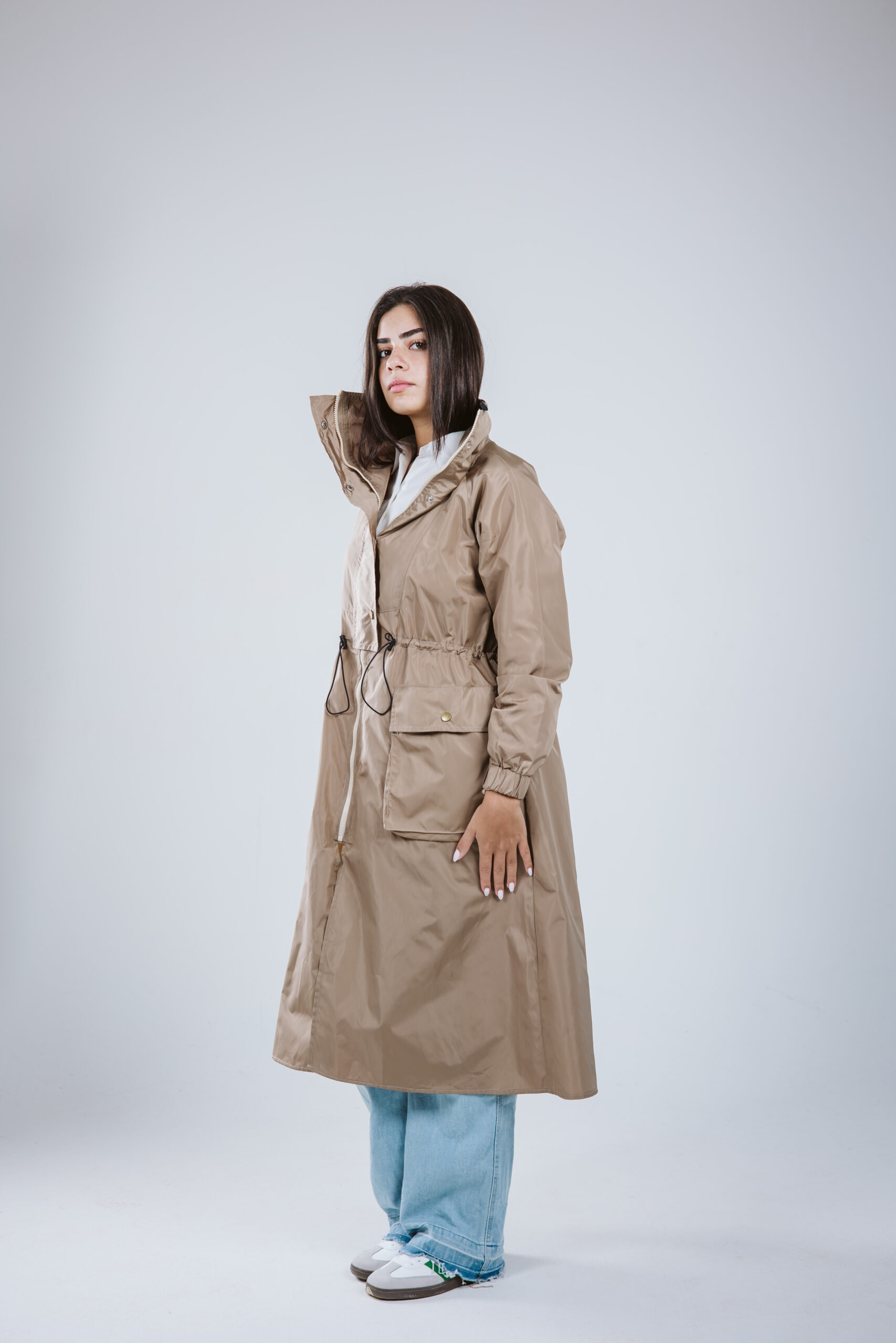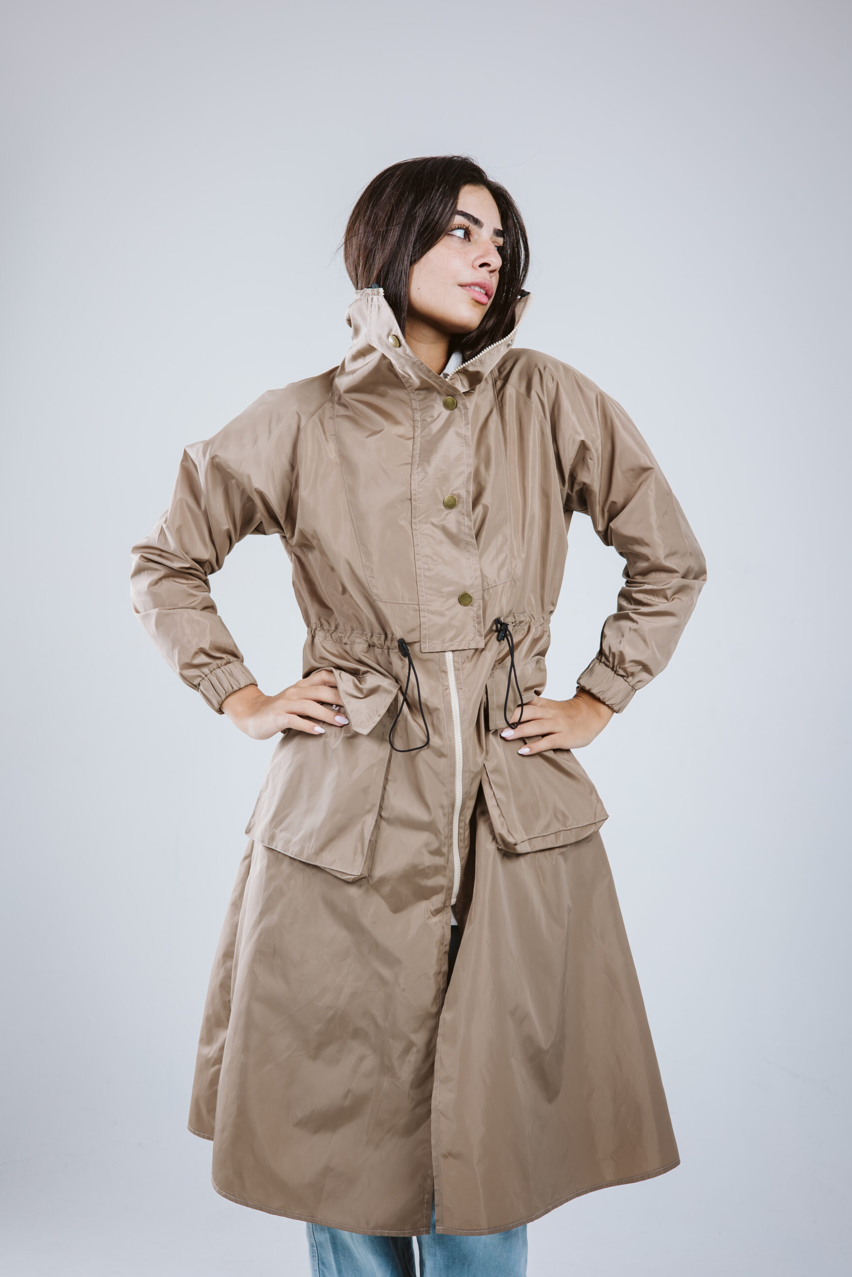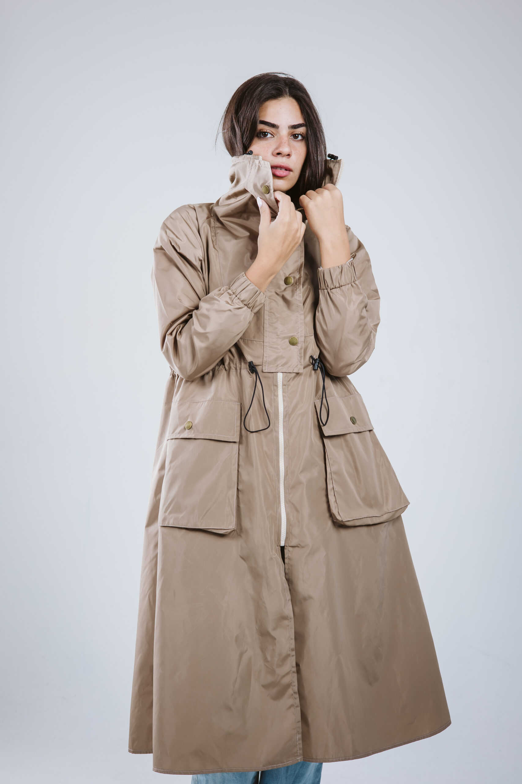 Our masterpiece for the season, blending gabardine with waterproof fine details.
